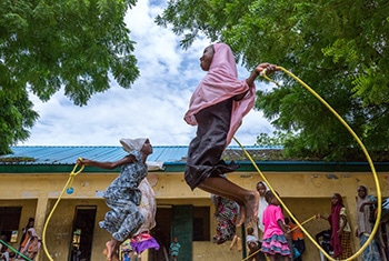 ![]() cUNICEF/UN028929/Esiebo 心理社会的ケアのプログラムの一環で、レクリエーションの時間になわとびで遊ぶ子どもたち。多くの子どもたちがボコ・ハラムによる攻撃でトラウマを抱えて逃げてきています。 |