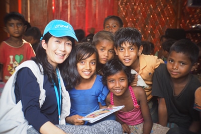 基本的に支援に頼ってしか生きることのできないロヒンギャ難民。国際的な支援なしには、衣食住を少しでも満たすことすら困難な状況です。着の身着のまま、飲み食いもほどんどなしに、何日もかけて危険な道や川を渡ってきたロヒンギャの人たちにとって、バングラデシュ側にたどり着いたときにユニセフの職員から差し出された水や食べ物、薬がどれほど救いだったことか。難民キャンプで暮らせるようになってからも、世界中からの支援によって届けられる医療や栄養治療、飲み水はロヒンギャ難民にとって命綱です。こうやってたくさんの「命」が助かっているだけでなく、勉強をしたり、安心して遊べることで、将来への「希望」を見出している子どもたちもいます。
