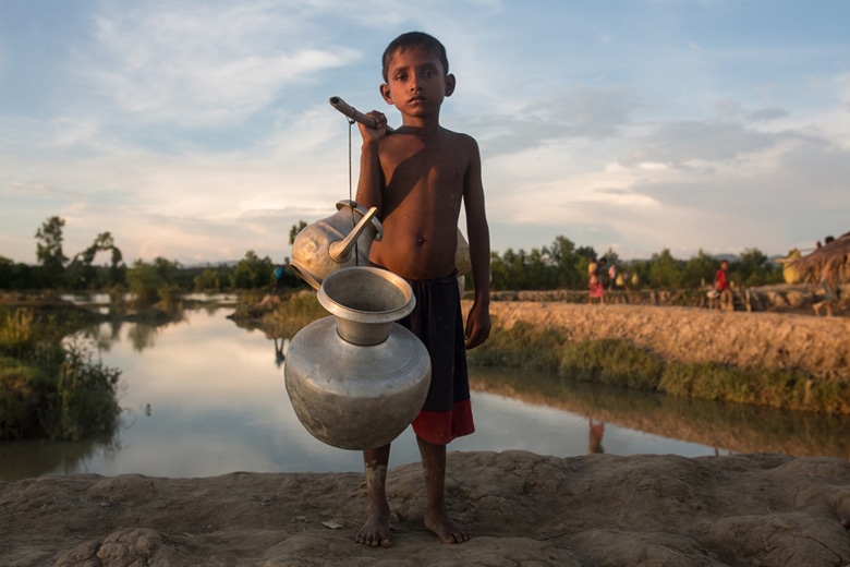 2017年の夏にミャンマーで激化した暴力から逃れるために、少数民族のロヒンギャの人々が隣の国バングラデシュに逃れています。バングラデシュのコックスバザールという地域には、すでに地元住民の人口を上回る68万8,000人以上の難民が押し寄せ、過密するキャンプや仮設居住区で避難生活を送っています。この難民危機により子ども72万人を含む120万人もの人々が、命と安全を守るための緊急の人道支援を必要としています。