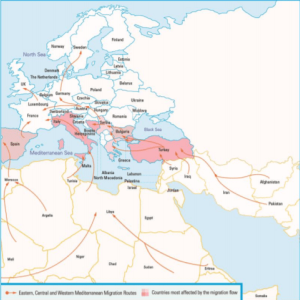 「地中海ルート(Mediterranean route)」と呼ばれるルートでヨーロッパを目指す人々の旅路」