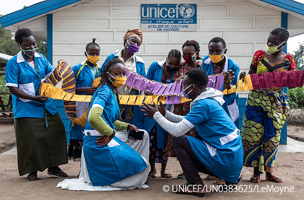 キゴンゼ国内避難民キャンプ内にユニセフが作った作業場の外で、製造したマスクを広げてポーズを決める若者たち。仕事がない若い世代への就業支援にもなっています。