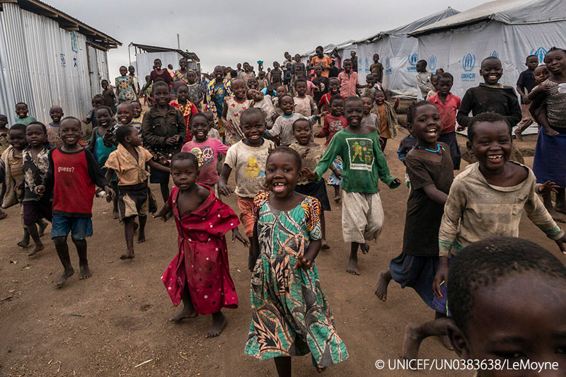 イツリ州のキゴンゼ国内避難民キャンプで遊ぶ子どもたち。ユニセフは、子どもたちが安心して過ごせる「子どもにやさしい空間」をキャンプ内につくっています。