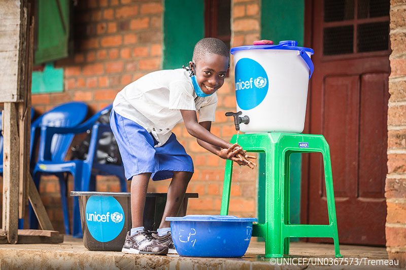 小学校の外に設置された仮設の手洗い場で手を洗う男の子。世界の43%の学校には、石けん付きの手洗い場がありません。