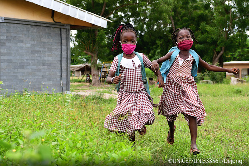 世界的な新型コロナウイルスの流行で休校になっていた小学校が再開され、久しぶりに友達に会って喜ぶ子どもたち