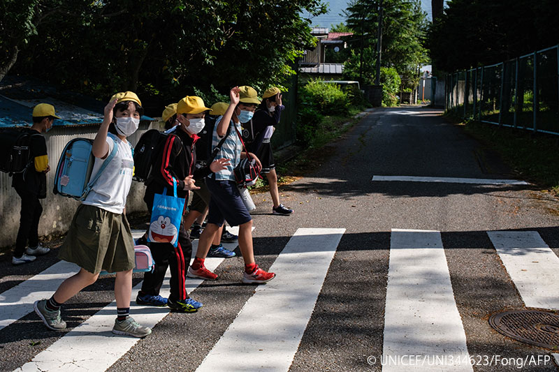 手を上げて横断歩道を渡る、通学中の日光市立鬼怒川小学校(栃木県)の子どもたち