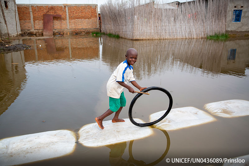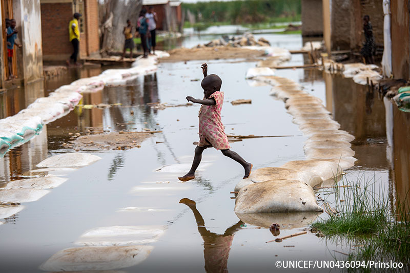 洪水は子どもたちにいくつもの危険をおよぼします。たとえば、飲み水が汚れてしまったり、不衛生な環境で生活をしなければならなくなることがあります。汚れた水や不衛生な環境によって、コレラなどのげり性の病気にかかる子どもが増え、多くのおさない子どもたちが命をうしなっています。