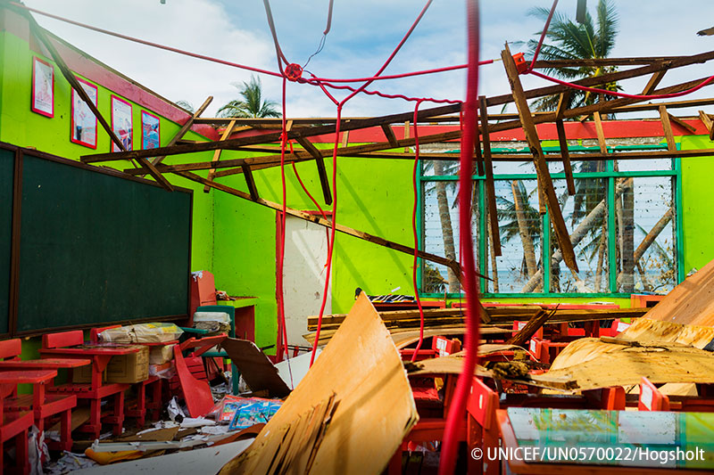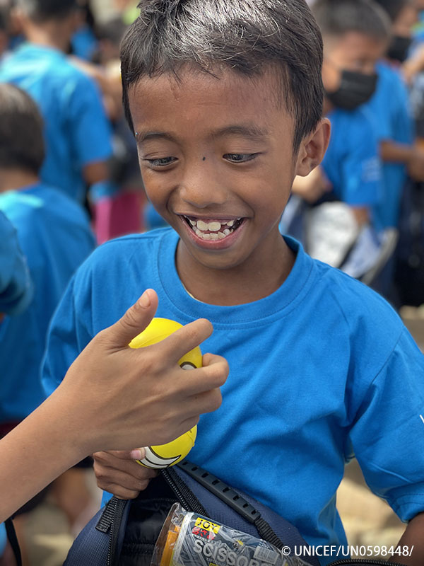 ユニセフは、台風で被災した学校で教育用品の配布しました。配布されたのは、文房具やノート、カラーマーカー、ユニセフのTシャツなどが入った生徒用のリュックサックです。先生にも、質の高い教育を再開するために必要な教材が提供されました。