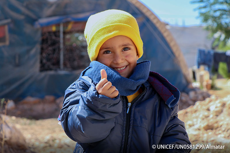 ユニセフは、シリアや周辺国で避難生活をおくる子どもたちに、暖かい冬用の衣服や靴などを届け、キャンプの子どもたちと家族を支援しています。