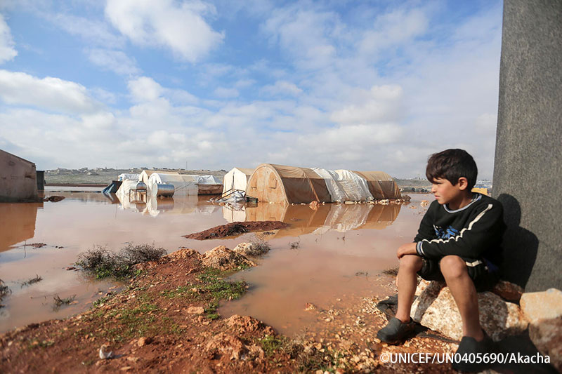 シリア北部では、紛争から逃れてきた何百万人もの子どもたちが、集中豪雨や雪などの厳しい天候にさらされ生活しています。