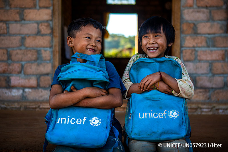 戦とうが続くミャンマーで、ユニセフのバッグを手にするアウン・キンくん(7歳)とカム・リーくん(7歳)。