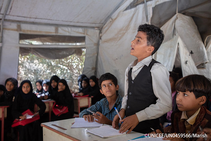 2015年3月に内戦が激化し、長期間にわたって紛争が続くイエメンで避難生活を送るアフメドくん(12歳)は、爆撃で破壊された学校に通っています。「今も学校に行くことはこわいけど、自分の夢をかなえるために勉強を続けている」と話します。