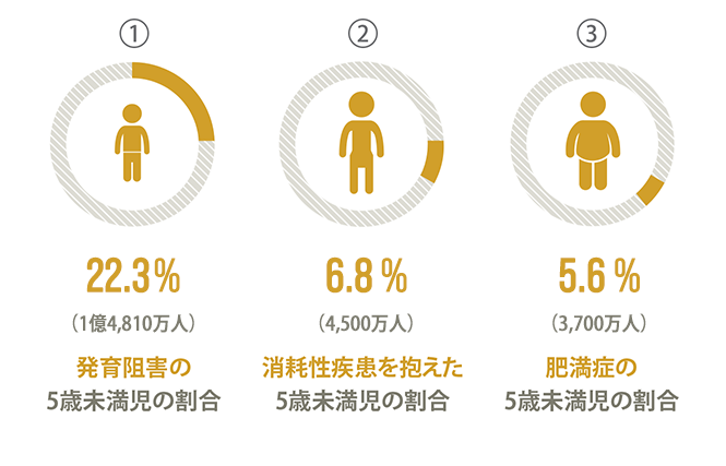 2022年現在、世界では1億4810万人もの子どもたちが、慢性的な栄養不良だと推定されています。この数値には、新型コロナウイルスのパンデミックによる影響がまだ反映されていないため、長期的にさらに増えていく可能性があります。子どものころの慢性的な栄養不良は、脳や身体の発達にも影響すると言われています。身体の成長に欠かせないたんぱく質や、病気と戦う免疫力(めんえきりょく)をつけるビタミンAなどの栄養素が足りないと、かぜやげりなど、ごくありふれた病気が原因で命を失う危険が高まります。