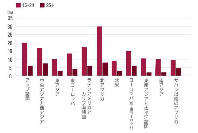 2020年に、15歳から24歳の若者の失業率(仕事につけない割合)がもっとも高かったのは約30%の北アフリカと、約20%のアラブ諸国でした。若者の失業率の高さは、社会を不安定にする原因にもなり、これからを担う若者たちが、より多くのチャンスを得られるようにすることが大切だと、国連も国際社会に協力を呼び掛けています。