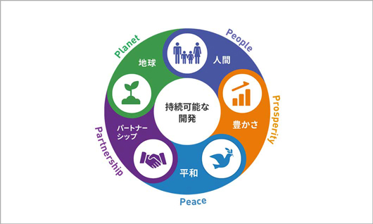 SDGsには17の目標がありますが、それらを5つのキーワードで考えると、より相互の関係性がイメージしやすくなります。具体的には、People(人間)、Prosperity(豊かさ)、Planet(地球)、Peace(平和)、Partnership(パートナーシップ) の5つの「P」に分類することができます。