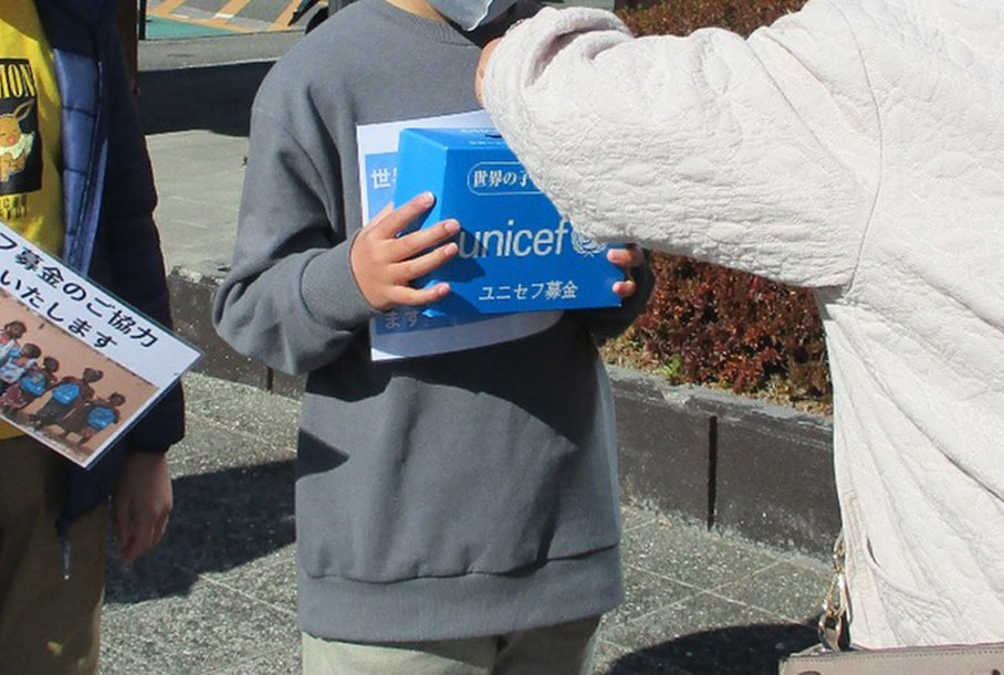 その思いを行動に移すために、1年間さまざまな活動に積極的に取り組みました。まず身近な人や地域の方に世界の現状やユニセフの活動について伝えるためのスライドやポスターを作成しました。そして2・3学期に募金活動に取り組みました。2学期は学校内で募金活動を実施し、募金活動の前には調べ学習で作成したスライドを使い、他学年に世界の課題について発表しました。その結果、全校からたくさんの募金を集めることができました。さらに3学期には、地域の3つのスーパーにご協力いただき、3日間にわたって募金活動を行いました。募金活動を3グループに分かれて行ったことで、より多くの地域の方に「世界には困っている人がたくさんいること」や「自分たちにもできることがあること」を伝えられました。最終的に学校と地域から集まった募金の合計は、20万円ちかくにのぼりました。
