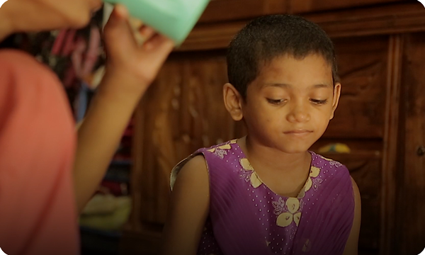 気候変動からもたらされた洪水で故郷を離れ、スラム街での生活を余儀なくされたスマイヤちゃん。栄養不良から消耗症に陥ってしまいます。消耗症の子どもは無気力でボーっとした状態(食欲もなく体の反応が低下した状態)になります。特に重症の乳幼児の場合は、むずがったり、泣いたりといった子どもの自然な反応を見せることなく、感染症であっという間に命を落とすこともあります。栄養治療をうけ、回復してくると、笑ったり、何かを欲しがったり、泣いたり、“子どもらしさ”を取りもどしていきます。