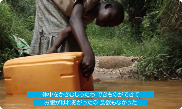 リリアンさん(14歳)が川へ水をくみに行くようす、くむ水の状態が分かる動画です。彼女のように、池や川の水(地表水)を未処理のまま使わざるを得ない人は世界に1億4400万人(2017年時点)いると推定されています。 -