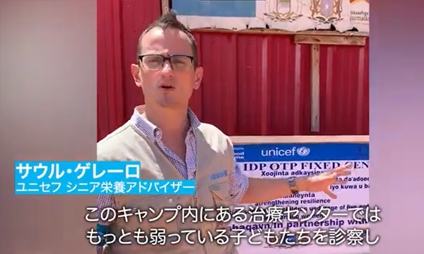 今までにない深刻な干ばつに見舞われているソマリア。干ばつの影響で、多くの子どもたちが栄養不良になっています。ユニセフの職員が、避難民キャンプに設けられた栄養治療センターを訪れ、子どもたちやユニセフの支援のようすを案内します。 -