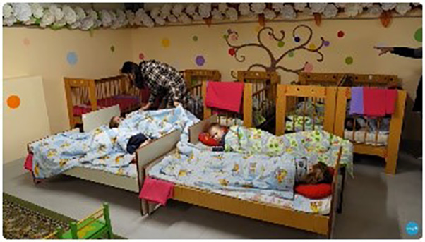 ウクライナでの紛争も終わりが見通せないなか、子どもたちを守りながら日常生活を送るための工夫が続いています。ユニセフの支援する幼稚園のシェルターが、子どもたちのお昼寝の時間と安心を守っています。 -
