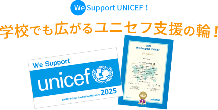 この活動が意義あるものであることをお伝えし、真摯な活動への取り組みを称えるために2017度より「We Support UNICEF賞」を新設いたしました。ユニセフ学校募金活動を含めたユニセフ活動に参加してくださった学校が対象となり、お申込みいただいた学校すべてに、記念のステッカーと賞状をお贈りします。