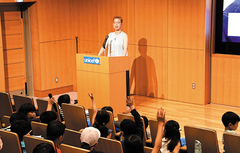ユニセフハウス見学ツアーとユニセフ日本人職員の講演会がセットになった親子向け夏休みイベントを開催。小学生の参加者はユニセフ職員の杢尾雪絵とも積極的に対話し、世界の紛争や貧困などの問題に目を向ける機会となりました。