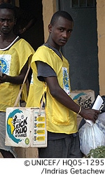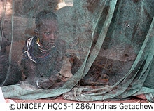 ユニセフはエチオピア政府と協力して、エチオピアの歴史上最大のマラリア対策プログラムを実施しようとしています。その一貫として、今年は250万件以上の、より治療効果の高い、アルテミシニンと他の抗マラリア薬を併用する治療法(ACT)の緊急薬がユニセフによって輸入されました。さらに、マラリアから子どもを守るために、9月末までに200万張以上の蚊帳(殺虫剤処理済みのもの)が配られ、更に2006年6月までに50万張の蚊帳が届けられる予定です。2005年末には、350万張以上の蚊帳が、エチオピア180万世帯の妊婦と子どもをマラリアから守るでしょう。しかし2010年までにマラリアを半減させるためには800万張以上の蚊帳が必要と推定されており、更に450万の蚊帳が必要です。
