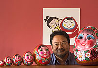寺院の外にある商店で販売されている鮮やかな色彩の張子の人形。これは14日(現地時間)、ヤンゴンで発表された 全国はしか根絶戦略の一環である、ミャンマー全国はしか予防接種キャンペーンのマスコットとなっている。