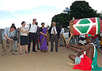 | ブルンジの子どもの保護施設、カボンドセンターで、子どもたちの太鼓と踊りのパフォーマンスに迎えられるラディカ・クマラスワミー国連特使 |