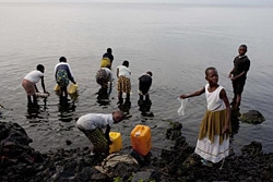| コンゴ民主共和国キブ州にあるキブ湖で水を汲む子どもたち。 |