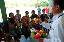 | 栄養のバランスのとれた食事の必要性をおもちゃのフルーツを使って母親に説く保健師(ラオス)。 |