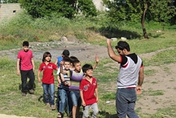 | 避難先のレバノンで外遊びをするシリア難民の子どもたち。レバノンは、シリア難民の最大の受入国です。ユニセフは、故郷シリアと避難先のレバノンとの様々な違いに戸惑う子どもたちへの心のケアも行っています。 |