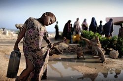 | ソマリアの難民キャンプで水を運ぶ女の子。 |