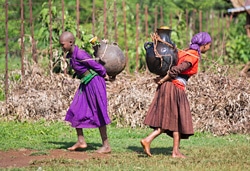 | エチオピアで水を汲んで家に帰る女の子たち。 |
