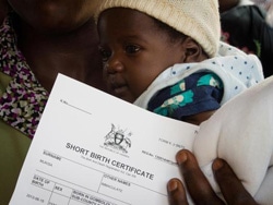 | ウガンダのムラゴ病院で携帯届出システム(MobileVRS)により発行された出生証明書と子ども |