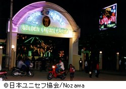 そして、私たちはカンボジアに渡り、働いている子どもたちのなかで、ワニーちゃんという子どもに出会いました。ワニーちゃんは13歳で、身長は140 cmほどです。日本の13歳の子どもたちと比べて小さいと思います。ポイペットには今、大きなカジノが建設されています。これは、タイ人のためにつくられています。タイではつくれないので、カンボジアにつくってタイ人が国境をこえてやってくるというわけです。このカジノの外と中では天国と地獄ほどの違いがあり、そのお客さん目当てにワニーちゃんのような子どもが、そのまわりで仕事をするのです。