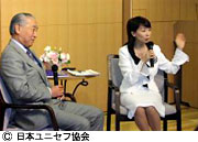 後半の東郷良尚さんとの対談では、グローバリゼーションがもたらす先進国と途上国における貧富の差が話題となりました。格差とは、物を得られるか得られないかだけでなく、情報に触れるなどのチャンスがあるかないかという側面もあります。グローバリゼーションはこの格差の広がりを加速させています。また、子ども買春や子ども兵士の撲滅を目標としたアドボカシー活動にも取り組みをはじめている協会の活動をご紹介しました。 「最近ユニセフに協力しやすくなりましたね」というアグネスさんに対し、東郷さんは日本の民間からのユニセフ募金が世界一であることに感謝を表しました。アグネスさんは、「世界一の民間の募金が出せる国です。私たちも勉強し、こういう子どもが一番困っているから、取り組みましょうといった発言ができる国民になっていきたいですね」と話しました。 |
