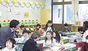 その後、ベネマン事務局長は小学1年生と幼稚園のクラスを見学。1年生のあるクラスでは、お箸の持ち方の授業が行なわれており、一生懸命学ぶ子どもたちの様子を見ながら、時おり話しかけるなどして、子どもたちと交流しました。