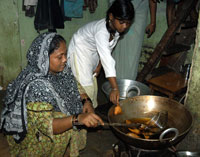 | 揚げ物料理の手伝いをする子ども=ネルナガール・スラム(東サンタクルス地区) |
