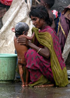 | 栄養不良の幼児の体を洗う母親=バラート・ナガール・スラム(東バンダラ地区) |