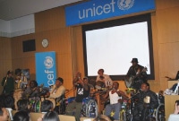 最後に挨拶した細川佳代子 世界の子どもにワクチンを日本委員会理事長が「素晴らしかった!もう一曲聴きたい」とリクエストすると、会場からは大きな歓声と拍手が沸き起こりました。これに応じたベンダ・ビリリのメンバーたちは、最後にもう一曲披露し、会場の盛り上がりは最高潮に達しました。 イベント終了後、ロビーでは、様々な障害のある人達が参加する日本のバンドグループ「サルサガムテープ」の演奏が披露され、楽しく力強い演奏の中で交流会が行われました。