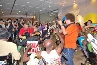 音楽評論家の松山晋也さんの紹介でホールに姿を現したスタッフ・ベンダ・ビリリのメンバーたちは、満員の会場から大きな拍手で迎えられました。彼らの力強く情熱的な演奏とパフォーマンスに会場は総立ちとなりました。参加者の皆さんの中には、手拍子だけでなく、リズムに合わせて踊りだす人も。その演奏は、今この素晴らしい人生を生きているんだと言わんばかりの情熱的で力強いものでした。