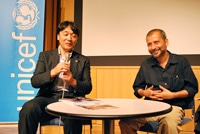 映画上映後、ユニセフ・東京事務所の平林国彦代表(元ユニセフ・インド事務所副代表)とソーラ ンギ監督との対談が行われました。平林代表は、監督にたくさんの質問を投げかけ、監督のこの映画に対する思いを伺うことができました。