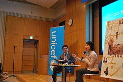 上映会に先立ち「子どもの幸せ」をテーマにしたトークショーを開催。ゲストにはユニセフ職員としてガーナでの勤務経験があり、現在は日本ユニセフ協会東日本大震災緊急支援本部 心理社会的ケアアドバイザーとして当協会の活動を支えてくださっている臨床心理士・プレイセラピストの本田涼子さんをお招きしました。本田さんは幼稚園や保育園の先生方、子育て支援関係者など、子どもと接するおとなたちに向け、「遊びを通した心のケア」に関する講習会などを行い、未就学児を中心とした子どもたちの心のケアの活動をされています。