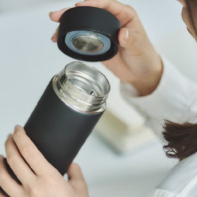 ボトルに茶葉を入れて、茶こしをカチッと音がするまで押し込み、上からゆっくりとお湯を注いでください。一気にお湯を注ぐと、飲み口から溢れる場合があります。また、細かい茶葉をそのまま入れると茶こしを通り抜けることがありますので、お茶パックに入れるなどしてご使用ください。氷入りの冷たい飲料を飲む際には、茶こしが氷をブロックします。
