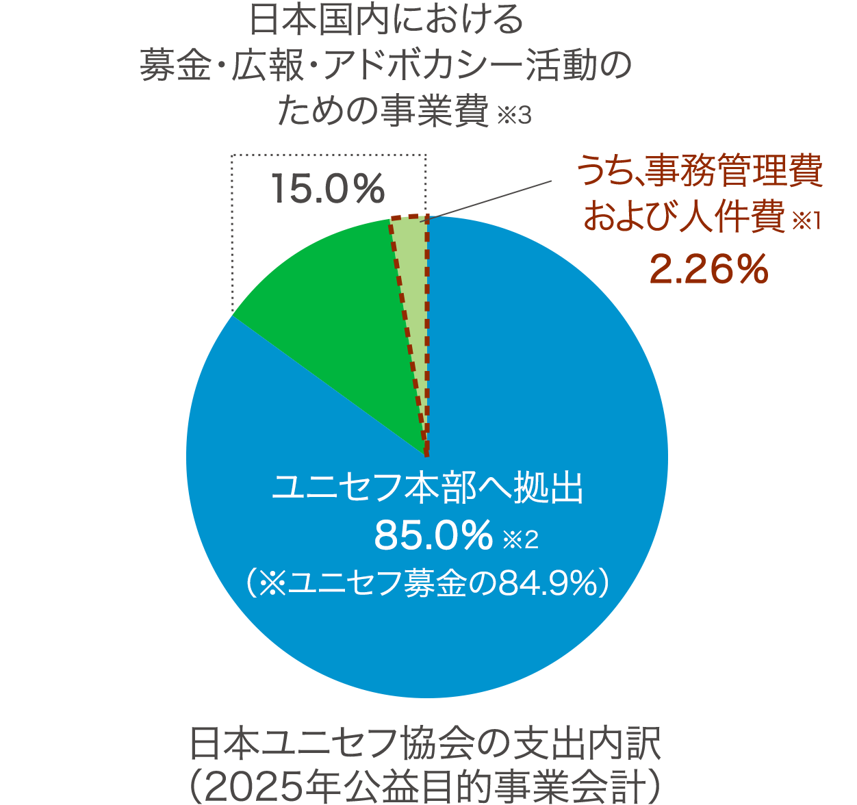 ※2 2025年のユニセフ本部への拠出金24,446,000,000円は、公益目的事業会計の経常費用計28,746,533,466円の85.0%、ユニセフ募金28,808,263,476円の84.9%にあたります。