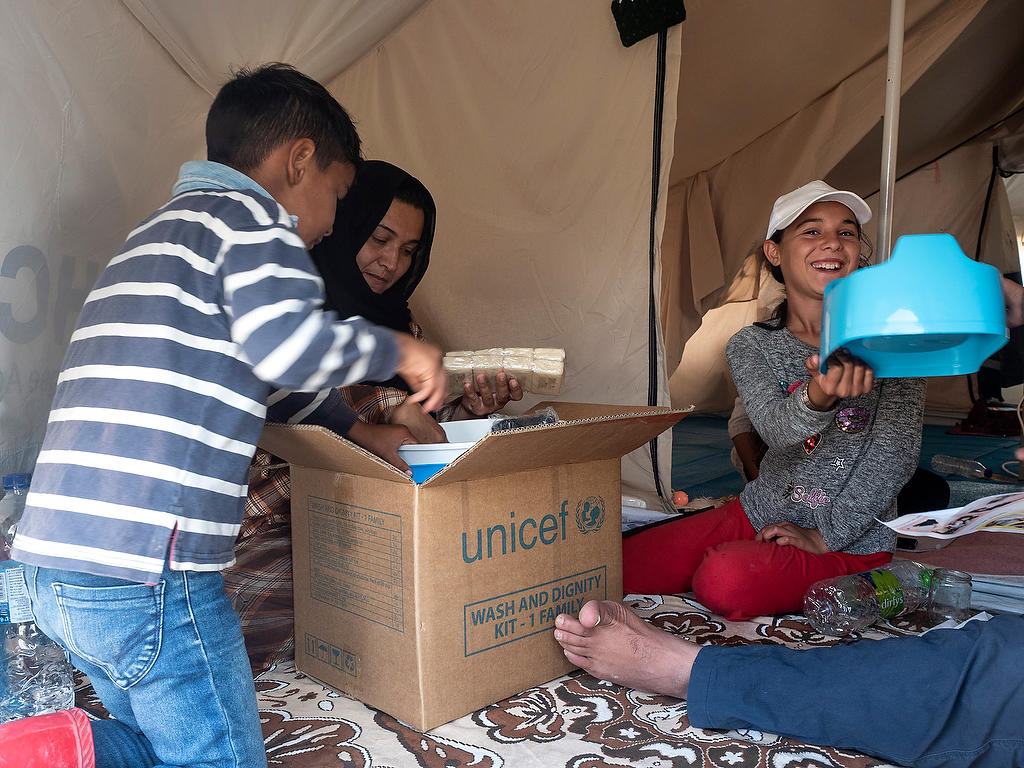 爆撃で浄水場や下水処理場などの水関連施設が破壊された被災地では、安全な水を確保することは非常に困難です。ユニセフは給水車を派遣し、子どもたちとその家族に安全な水を届けるとともに、浄水剤の提供なども行っています。