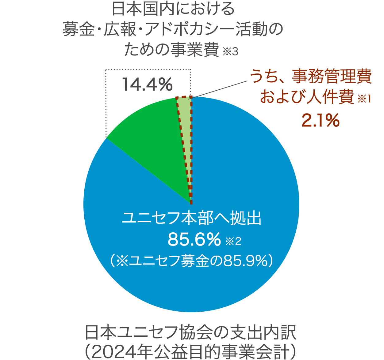 ※3 ユニセフ支援の輪を広げるための、国内での募金活動(領収書/寄付控除申請書類の印刷・発送費や振込/決済に係る費用などを含む)、広報・アドボカシー活動、国際協力に携わる人材の育成活動。