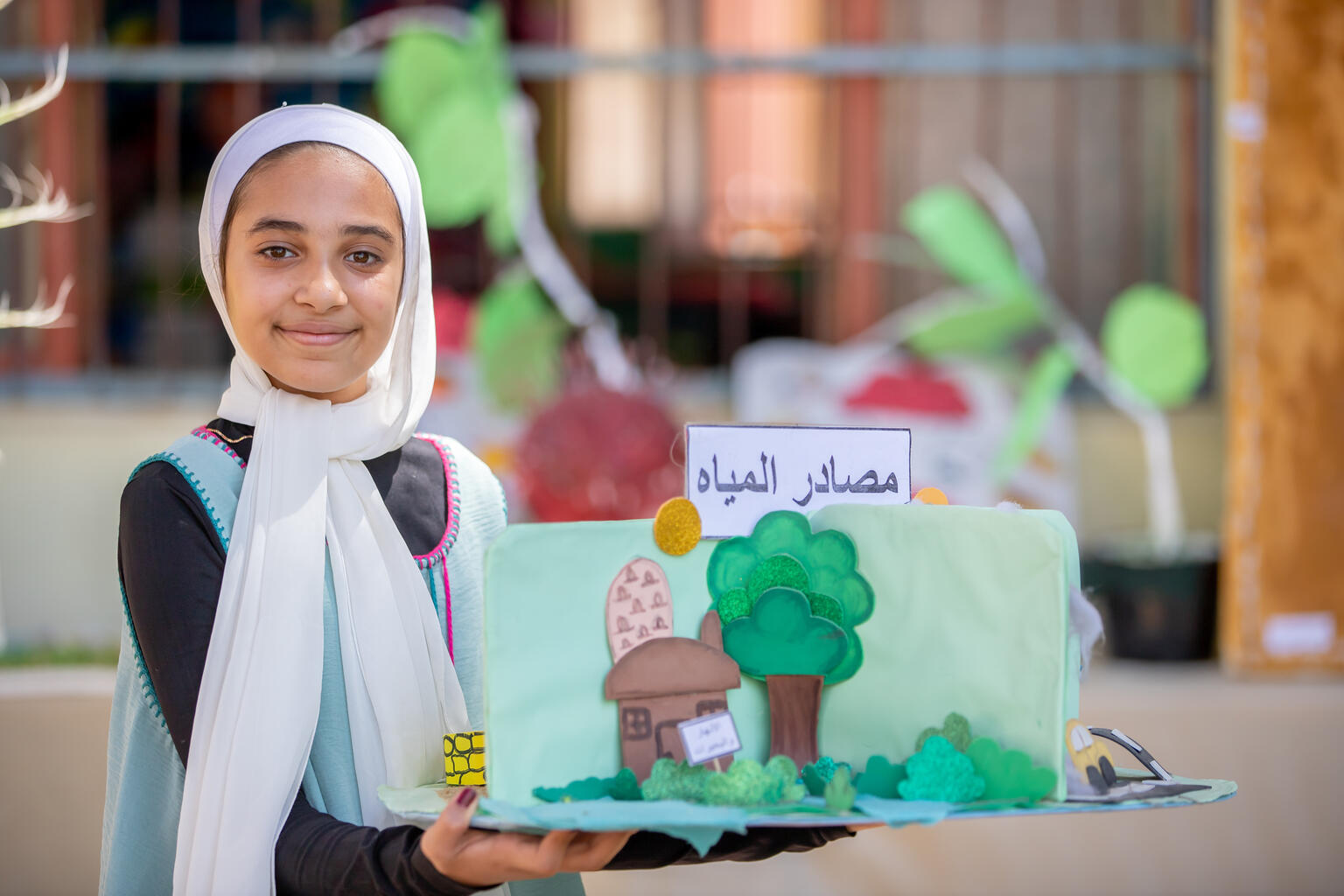 ユニセフの支援により実施された、環境や気候変動をテーマにしたサマーキャンプには、ジャナさんを含む約3万人の小学生が参加し、水の大切さや資源の再利用などについて学びました。ジャナさんの通う小学校では、環境をテーマにしたアート展も開催され、子どもたちが制作した作品が並びました。ジャナさんたちは作品を通じて、リサイクルや環境保護など、持続可能な未来に向けた行動を呼びかけています。