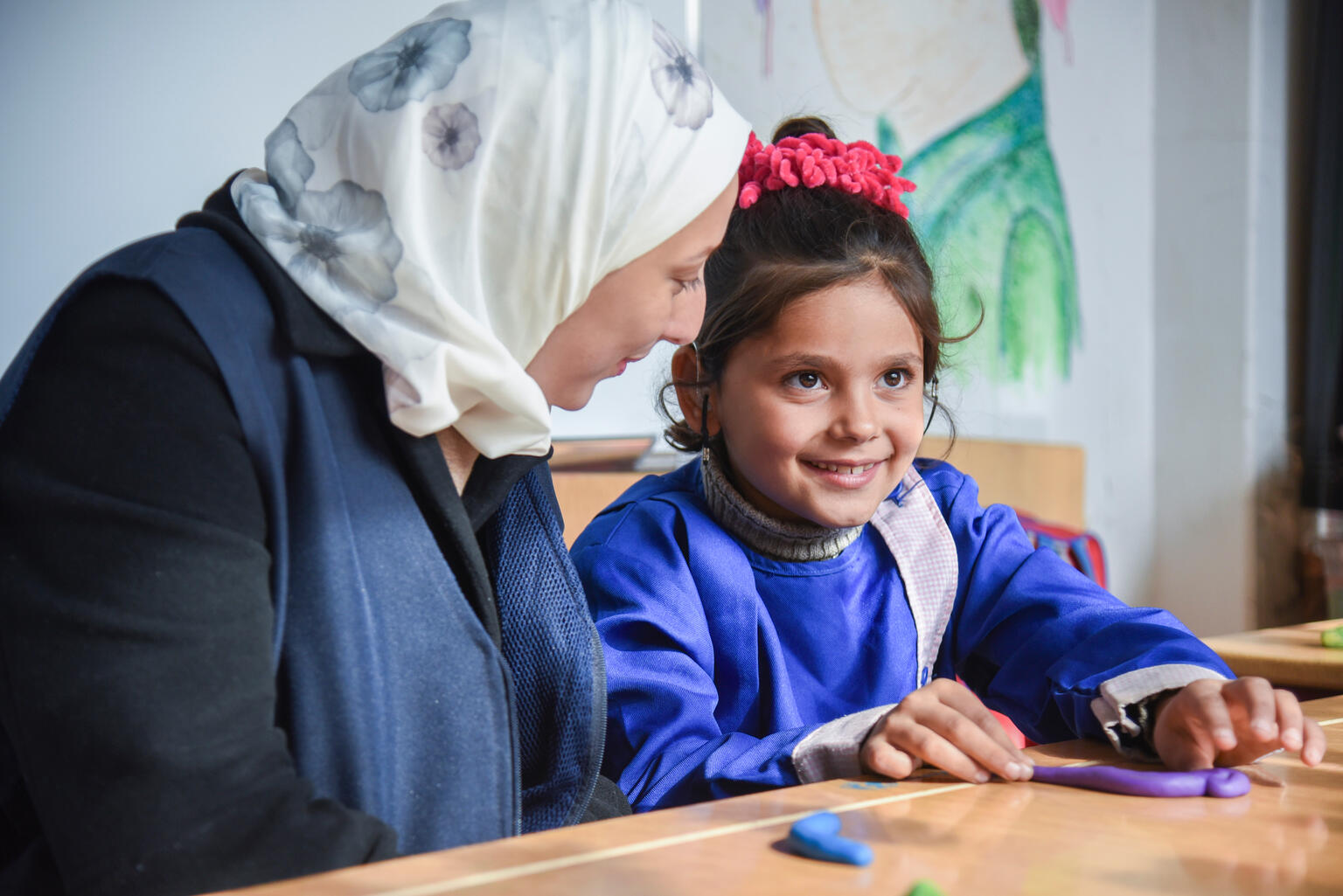 ユニセフの支援を受けて、個々の障がいに応じたサポートを提供してくれる学校に通い始めたヌールさん。「新しいお友だちもできたの。仲良くしてくれるし、みーんなだいすき!」