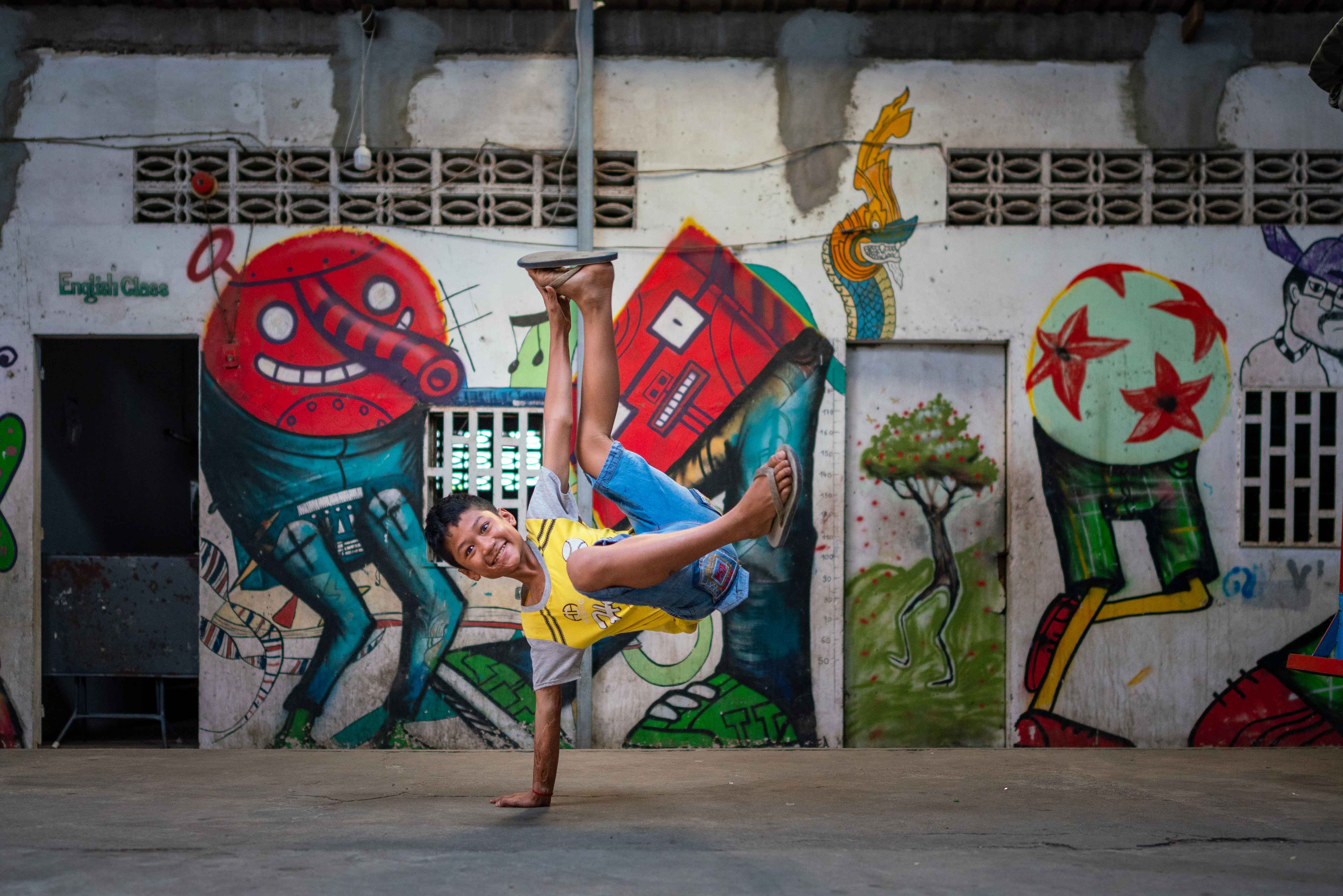 アンコールワットの遺跡で有名な東南アジアの国、カンボジアの首都プノンペンで暮らすブンテンさん。おもしろい動きを考えて、ダンスで表現をするのが大好きです。激しい振り付けでも、いつも笑顔を絶やしません。